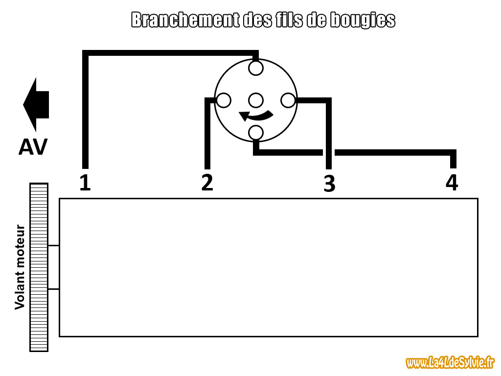Remettre en place le fil de la bobine et les fils de bougies dans le bon ordre (pour rappel : l'ordre d'allumage est 1-3-4-2, le cylindre 1 étant celui coté volant moteur et donc le cylindre 4 coté distribution, l'allumeur tourne dans le sens horaire vue de dessus aussi bien pour les moteurs Billancourt que pour les moteurs Cléon).